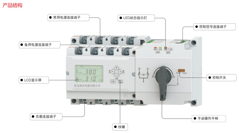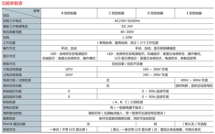 控制器具有欠壓、過壓、斷相自動切換功能和電動強制切換功能,自動模式集成自投自復和自投不自復兩種模式,適應不同使用場合;具有消防聯(lián)動功能,滿足緊急情況下斷開負載側電源的要求。