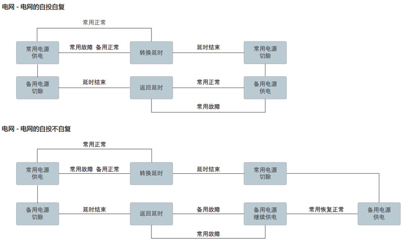 在電網 - 電網的應用中,自動轉換開關可以提供自投自復和自投不自復兩種轉換類型
