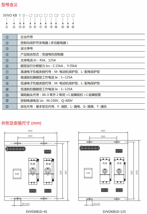 以數(shù)字化產(chǎn)品 SVVOKB1作為主開關(guān),集成熔斷器、斷路器、接觸器、起動(dòng)器、隔離器、熱繼電器、過載 ( 或 過流、斷相 ) 保護(hù)繼電器、電機(jī)綜合保護(hù)器、智能漏電繼電器等低壓電器產(chǎn)品功能于一體,與相應(yīng)的接觸 器及其他必需的附件,通過機(jī)械聯(lián)鎖和電氣聯(lián)鎖構(gòu)成新型保護(hù)式 SVVOKB1-D 雙速電機(jī)控制與保護(hù)開關(guān)電器, 實(shí)現(xiàn)集成化的、內(nèi)部協(xié)調(diào)配合的雙速電機(jī)自動(dòng)控制與各種保護(hù)功能,適用于雙速電動(dòng)機(jī)的起動(dòng)控制與保護(hù)。